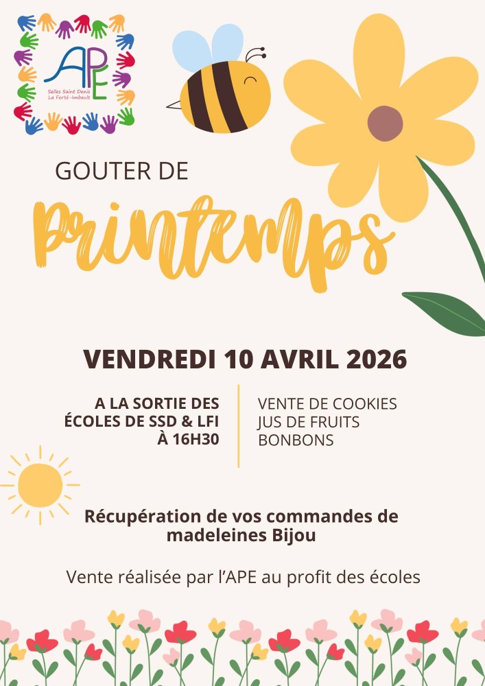 👉 Rendez-vous ce vendredi 10 avril à la sortie de l'école de La Ferté-Imbault pour le traditionnel gouter de printemps proposé et organisé par l'Association des Parents d'Élèves.